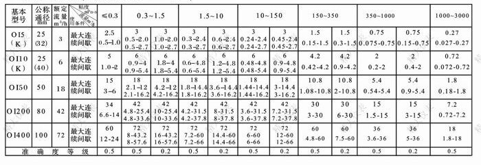 備注:1.測量冷水的流量范圍,連續運行時(shí)大流量取0.3-1.5mPa.s欄中最大流量的50%;最大流量取欄中最大流量的70%;