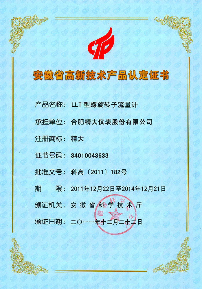省高新技術(shù)產(chǎn)品認定證書(shū)(LLT雙轉子)